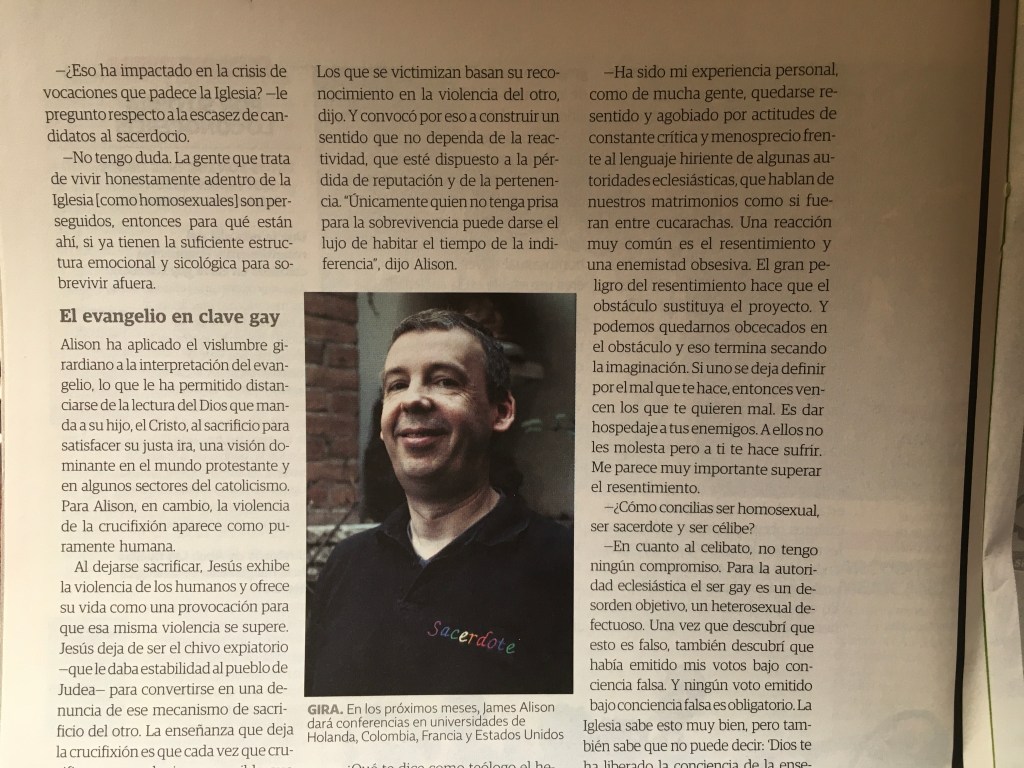 James Alison es un sacerdote abiertamente homosexual, que además escribe teología a favor de la inclusión radical de gays, lesbianas, trans y queers en la Iglesia católica. Alison vino a México en 2012 y lo entrevisté para la hoy fallecida revista Domingo, de El Universal. Acá nuestra conversación.