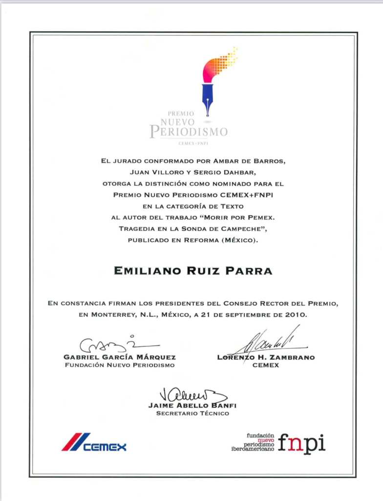 Crónica de uno de los peores accidentes petroleros en aguas mexicanas: 22 trabajadores fallecieron en la Sonda de Campeche tras una fuga de petróleo y gas en la Plataforma Usumacinta. Esta historia fue nominada al Premio Gabo en 2010 y se tradujo al inglés y al holandés.