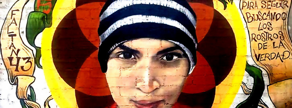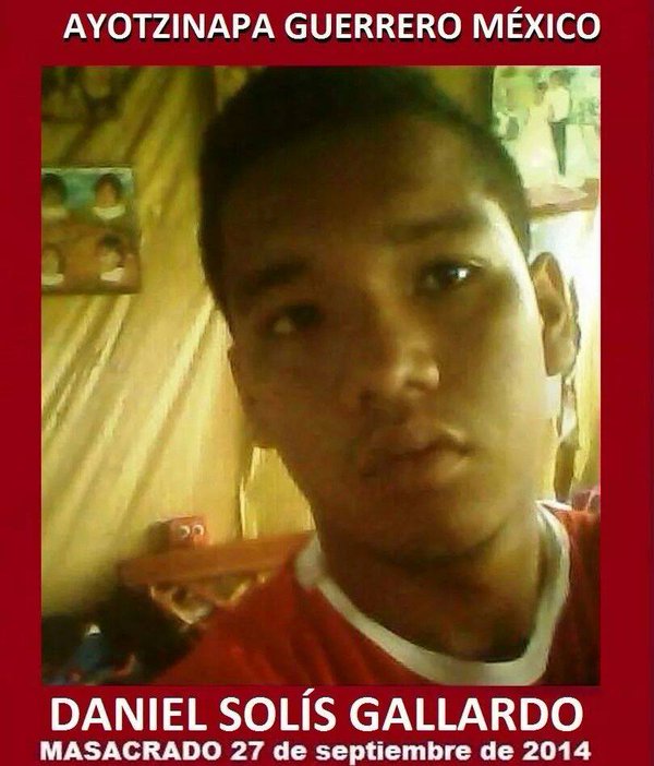 Su rostro casi siempre sale de lado porque era tímido y no le gustaba mirar a la cámara. De lado en la foto del tamaño de una cobija que dice «Siempre te recordaremos Profe Borre». (Borrego o El Borre por los cabellos chinos). Y su rostro de lado en esa imagen que le tomaron por sorpresa en su dormitorio de Ayotzinapa, en donde se ven otros seis normalistas. De lado también en un video en donde su equipo gana un partido de futbol y él sonríe después de la ronda de penaltis. Por eso me llama la atención una foto en donde Daniel Solís Gallardo mira de frente a la cámara y ríe, porque se reía todo el tiempo, risada y risada, como lo recuerda su madre. Viste pantalones de mezclilla y playera azul. Lo enmarca un muro con frases sobre rebeldía y libertad, y la pintura de unos enormes ojos que se asoman en un pasamontañas. A Daniel se le ve feliz, con la alegría de los 18 años.