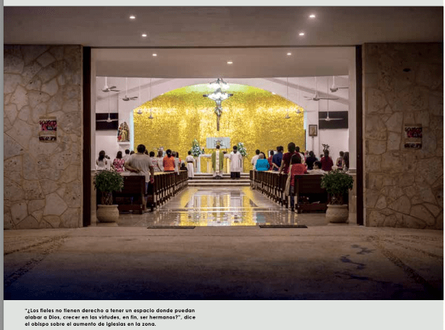 -La última es en Playa del Carmen, se llama Villas del Sol. Está metido en el monte. Los fieles católicos insisten que les den un espacio como en todas partes del mundo, que es terreno de equipamiento. Este terreno de equipamiento está señalado que es el 15 por ciento del desarrollo para que hicieran escuela, iglesia, hospital, mercado, bomberos, policía, servicios públicos. En el municipio el encargado de Asuntos Religiosos les dice: “si quieren la Semana Santa ahí, limpien su terrenito y celebren las ceremonias religiosas de la Semana Santa”. Limpiaron, pusieron la cruz y pues llegaron los periódicos: “Que el obispo está invadiendo, que es el más rico del mundo”. Yo ni sabía, yo no tenía ni idea. Aquí [en Cancún] es enormemente mucho más grande y ha habido lugares sin que se entere nadie los fieles han dicho: “Aquí vamos a hacer nuestra iglesita”. ¿Y por qué no? Y comienzan, y ponen su tingladito, y al rato llaman a un padre, y al rato están rezando el rosario debajo de un árbol, y se juntan. Digo, ¿no tienen derecho a tener un espacio donde puedan alabar a Dios, crecer en las virtudes, en fin, ser hermanos, construir comunidad, que están solos, que vienen uno de Tabasco, otro de Campeche, otro de Veracruz y quieren los vecinos juntarse para tener un ratito de convivencia…