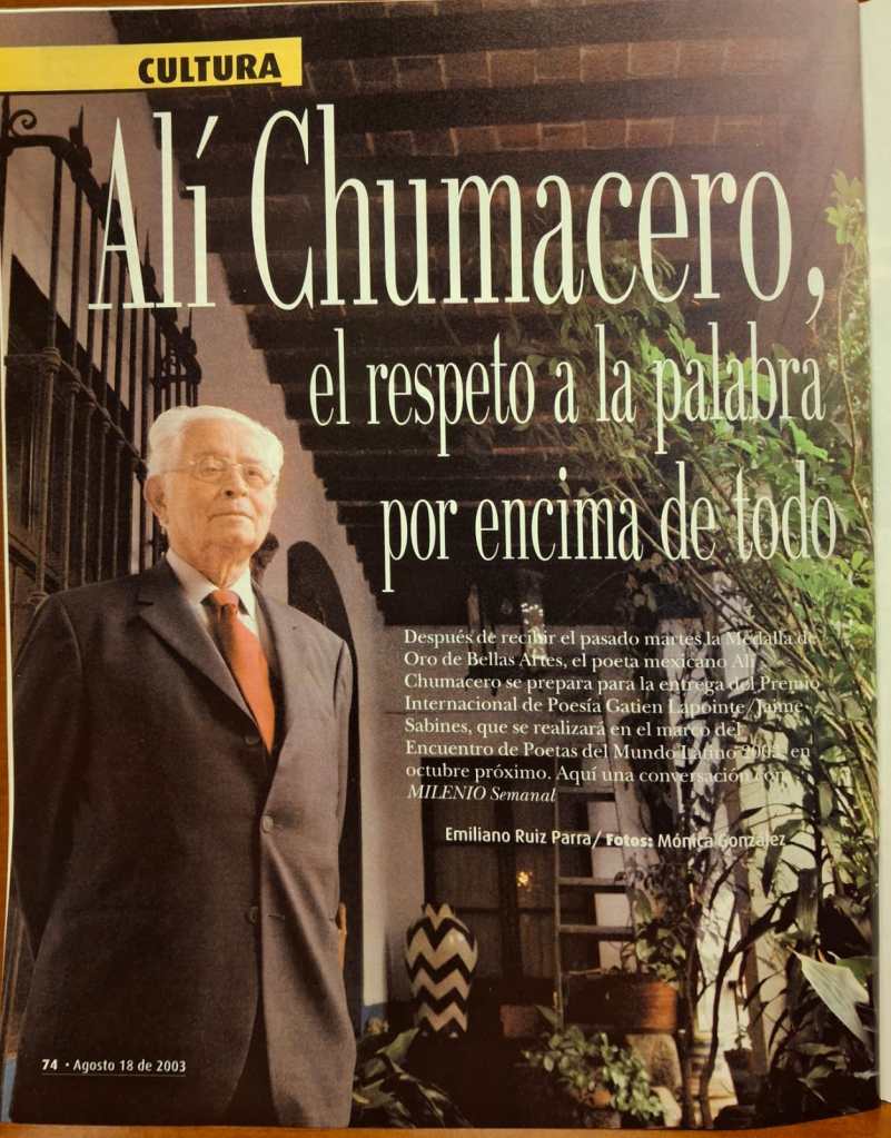 En 2002 conocí a Alí Chumacero en las oficinas del Fondo de Cultura Económica (FCE). Nunca le fallaba el traje oscuro y la corbata fina. Con el pretexto de servirle el café, me sentaba a conversar con él. Una vez me invitó a su casa y de esa visita –donde desayunamos whisky– publiqué mi primera entrevista, que Milenio ilustró con preciosas fotos de Mónica González. Este 22 de octubre conmemoramos 15 años de su partida.