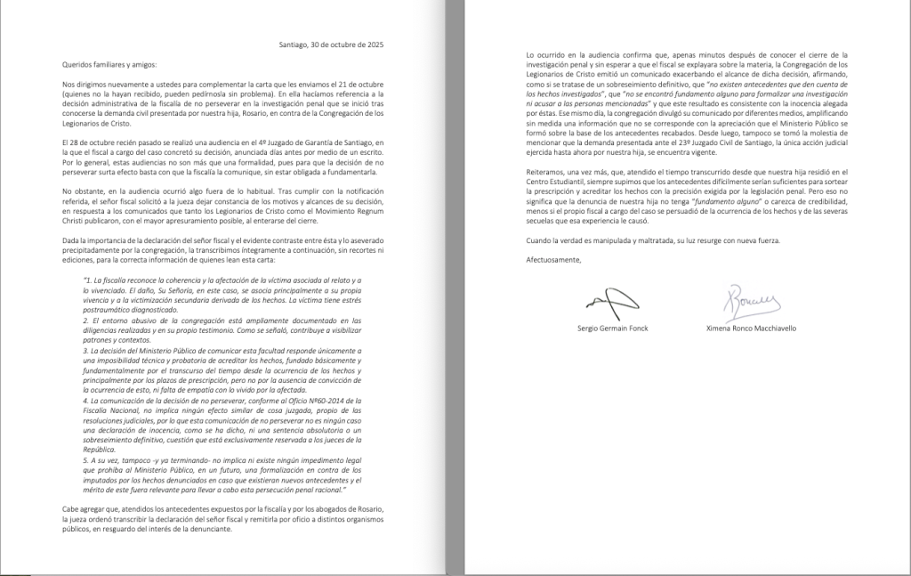 La comunidad del Colegio San Isidro reaccionó con una misiva firmada por 500 padres de familia respaldando las denuncias: “Nos emociona y nos provoca una profunda admiración y gratitud tu valentía. Tu testimonio, el de Rosario y el de muchos otros niños y niñas que siendo adultos se han atrevido a denunciar, son el motor de la energía transformadora que se vive hoy en nuestra comunidad”.