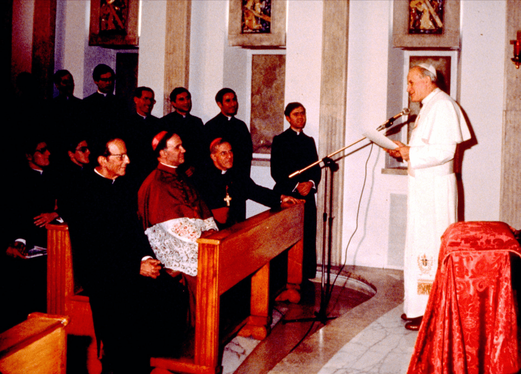 Marcial Maciel en una toma de 1980, en las escalinatas de la Plaza de San Pedro, Roma, rodeado de los Legionarios de Cristo y con un letrero fechado en 1980. Marcial Maciel dice: